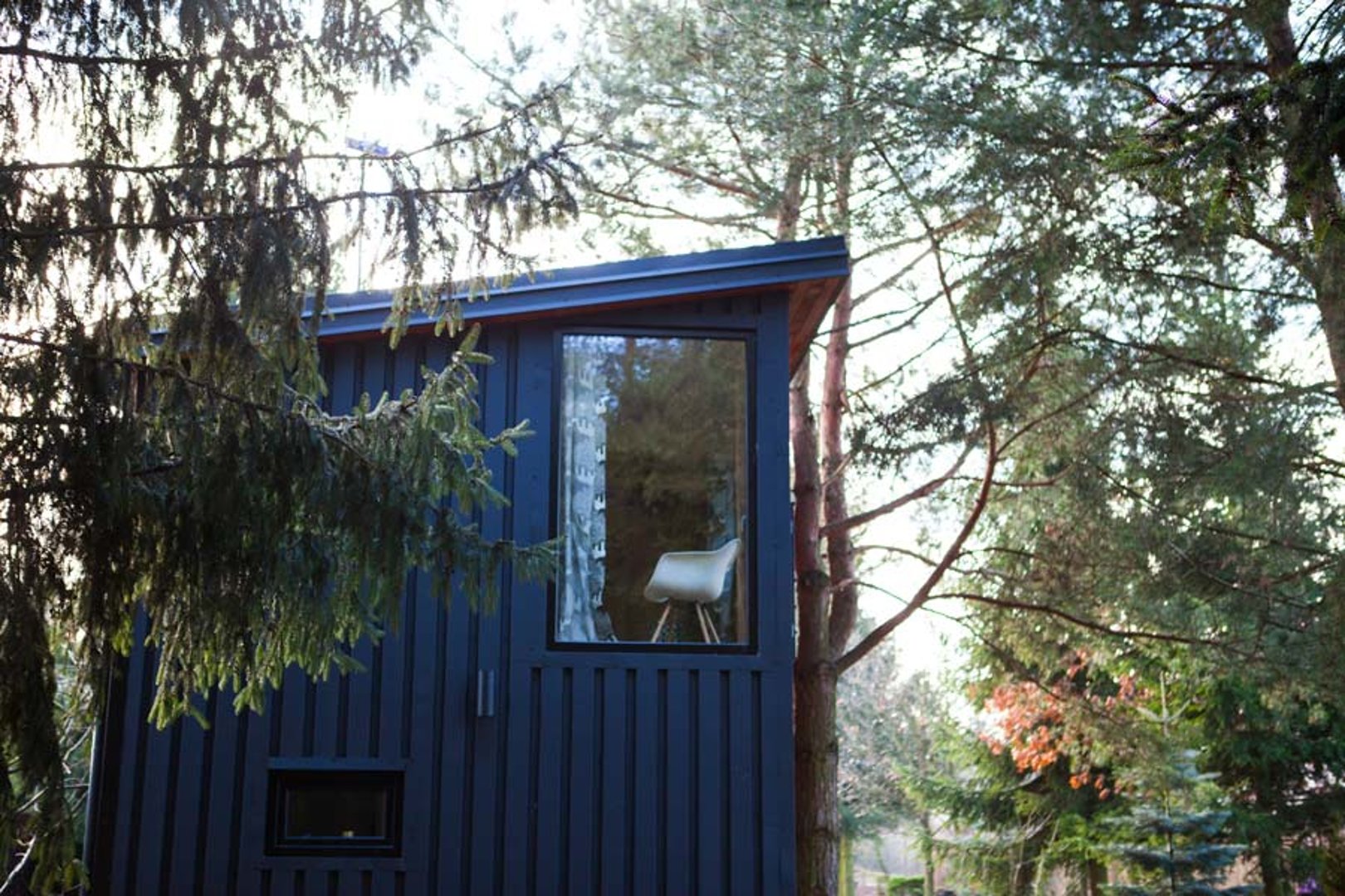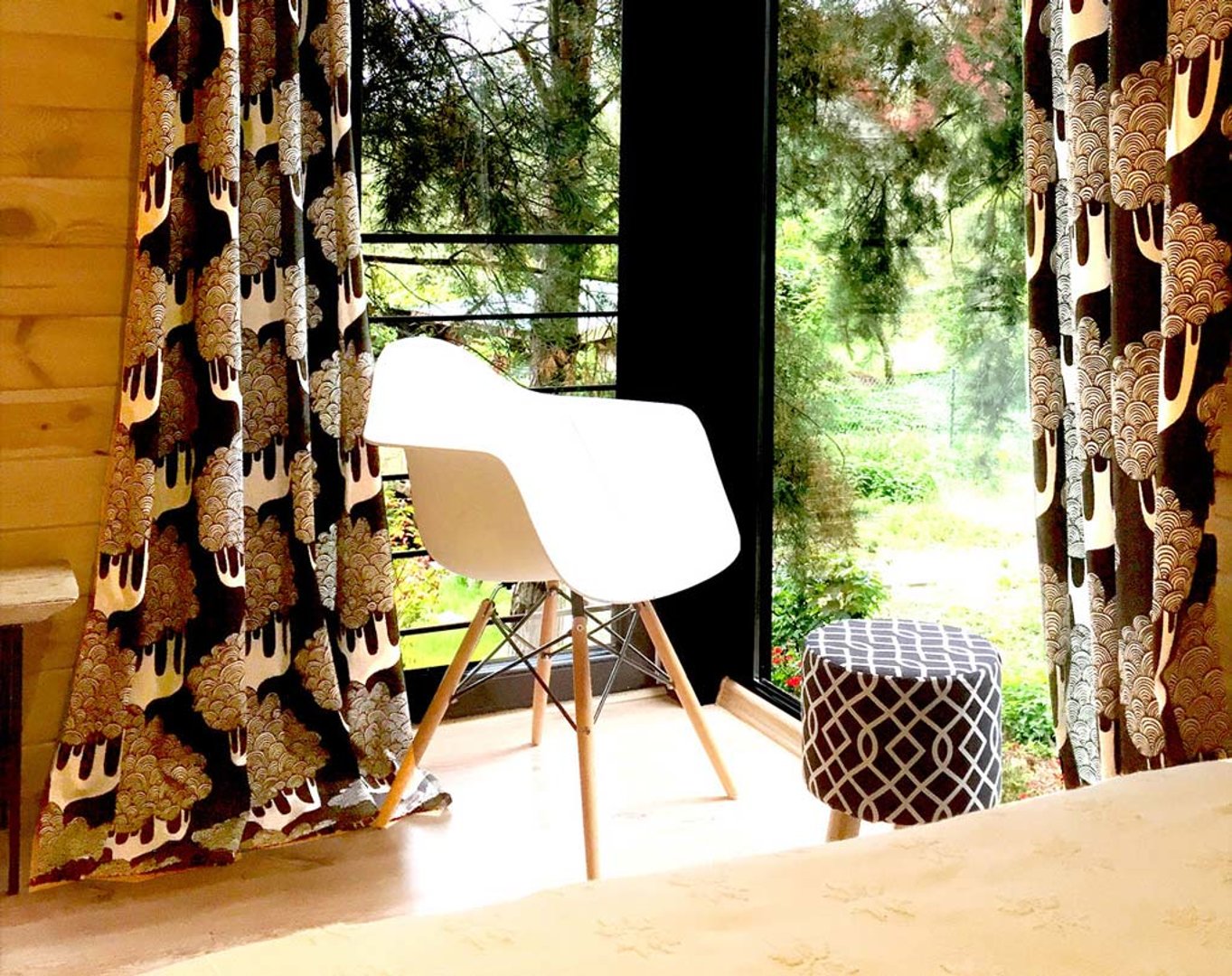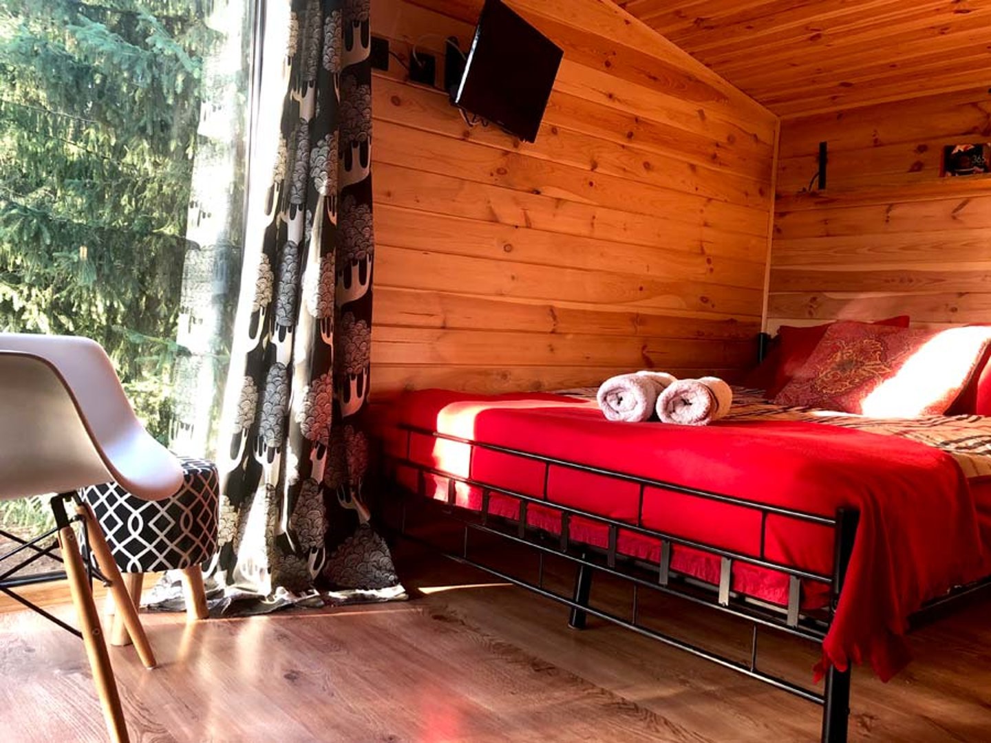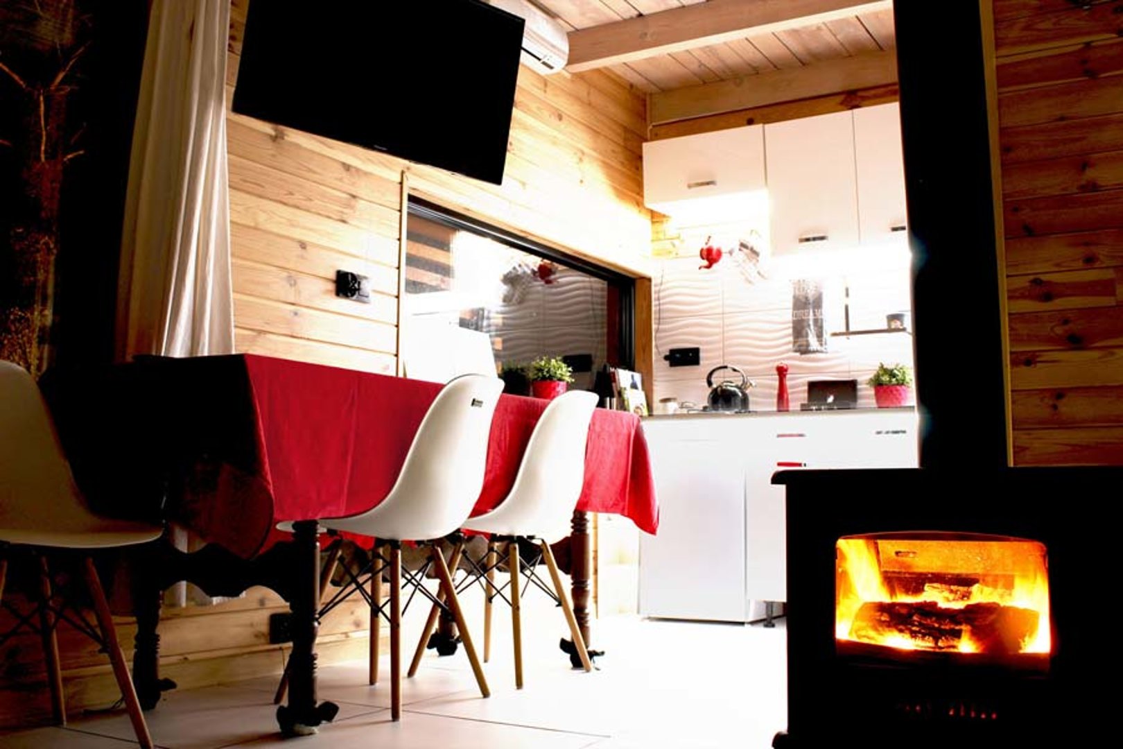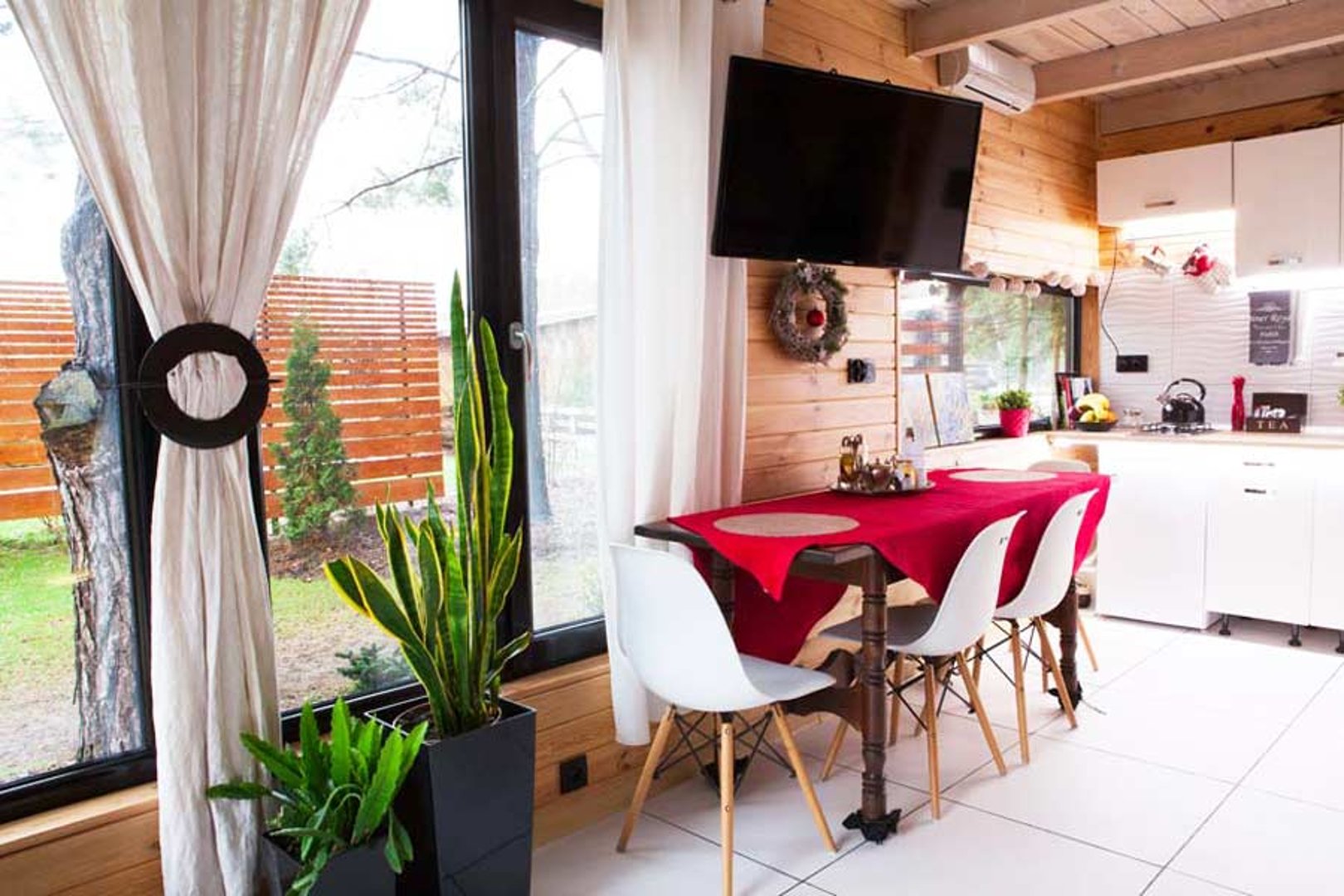 Charakterystyczny, nowoczesny design, przytulne, przemyślane wnętrze w całości wykończone w drewnie. Domek to łącznie ok. 55m2 powierzchni użytkowej. Parter to otwarta przestrzeń, gdzie znajda Państwo wyposażony aneks kuchenny z kuchenką gazowa 2-palnikową i lodówką, stół z krzesłami, kanapę usytuowaną przy kominku oraz 42″ TV z płaskim ekranem. Łazienka wyposażona jest w wannę z prysznicem. Na piętrze znajdują się 2 małe sypialnie, w pierwszej łóżko małżeńskie 140 cm, TV oraz panoramiczne okno wyglądające prosto w korony drzew, w drugiej zaś 3 pojedyncze łóżka, jedno z nich może być z barierką – idealne dla młodszych dzieci. Jest tu też kącik z książkami i grami dla większych i mniejszych Gości.